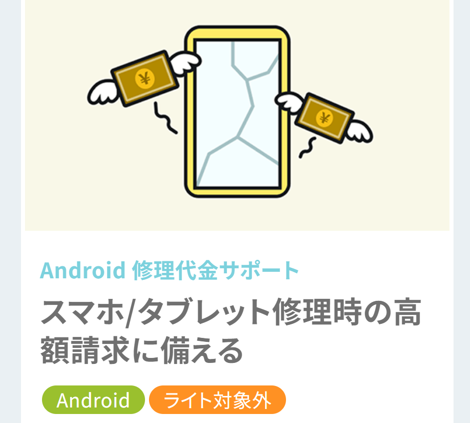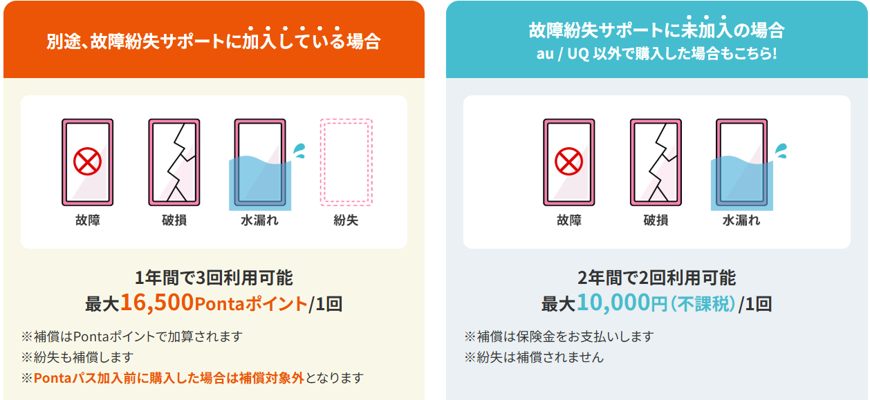 Android 修理代金サポートは、故障紛失サポートの加入状況により補償内容が変わります。また、Pontaパスの加入時期などによっては対象外の場合もあるため、まずは詳しい補償内容をこちらのページで確認しましょう。