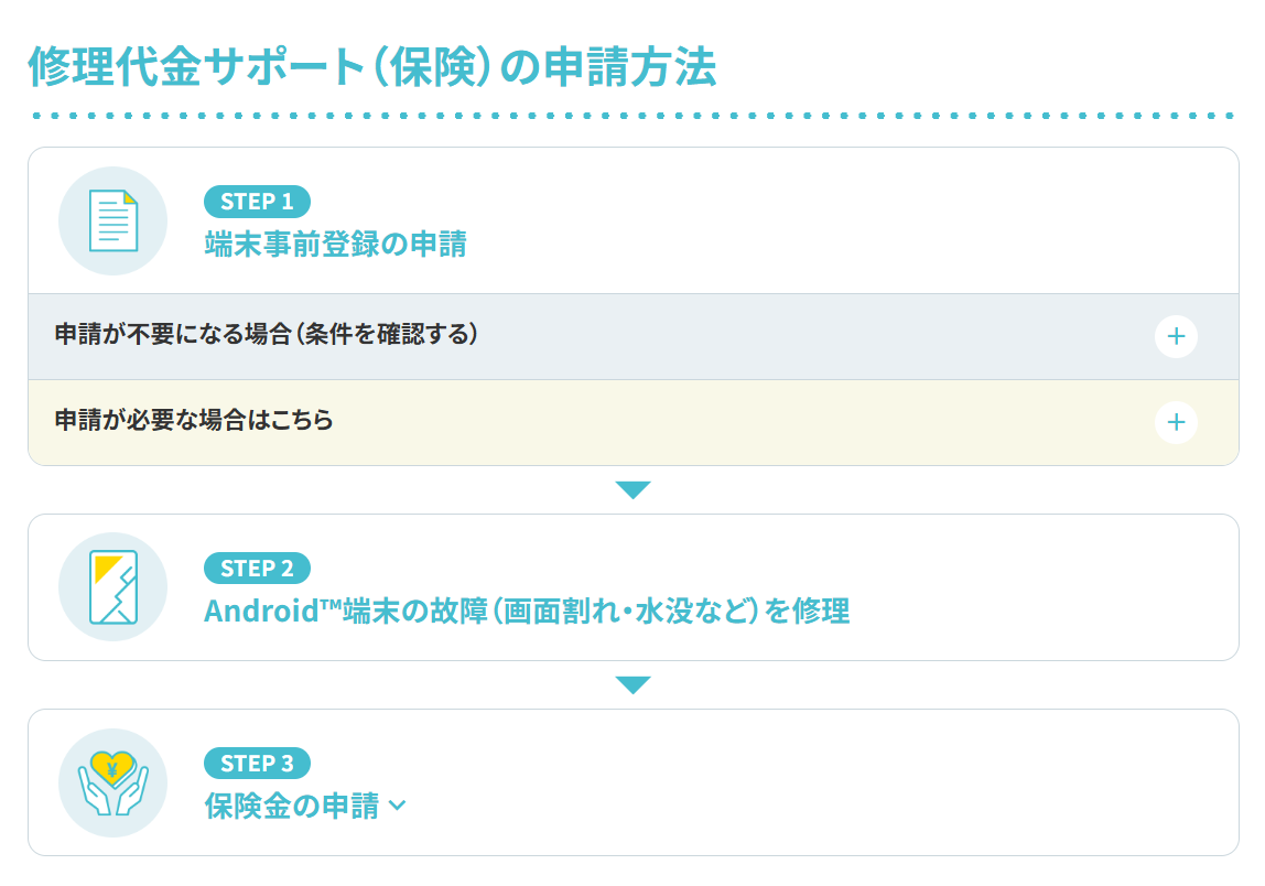 申請は「Android 修理代金サポート」からおこないます。修理報告書もWebでアップロードできるので、手書きや郵送などの手間はなくスムーズに手続きできます。