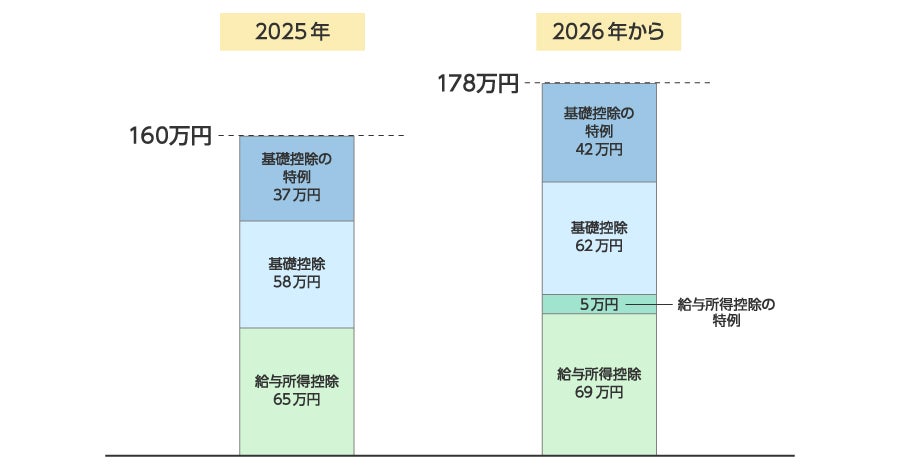 2025年の税制改正で、所得税が生じる年収の目安は103万円から160万円に引き上げられました。2026年も基礎控除や給与所得控除の増額で自民党と国民民主党が合意しており、「160万円の壁」は「178万円の壁」へと引き上げられる見込みです。