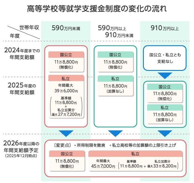 これは、私立高校の平均的な授業料水準を意識した金額であり、「授業料だけを見れば、以前より負担が軽くなる家庭が増える」ことが期待されています。