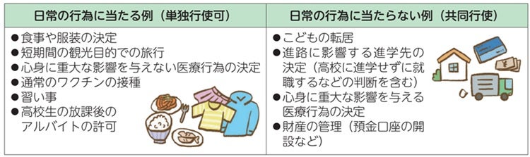共同親権では、食事や服装などの日常的なことは片方の親が決められる一方で、進学や医療、教育方針など子どもに関する重要なことは父母で話し合って決定します。
