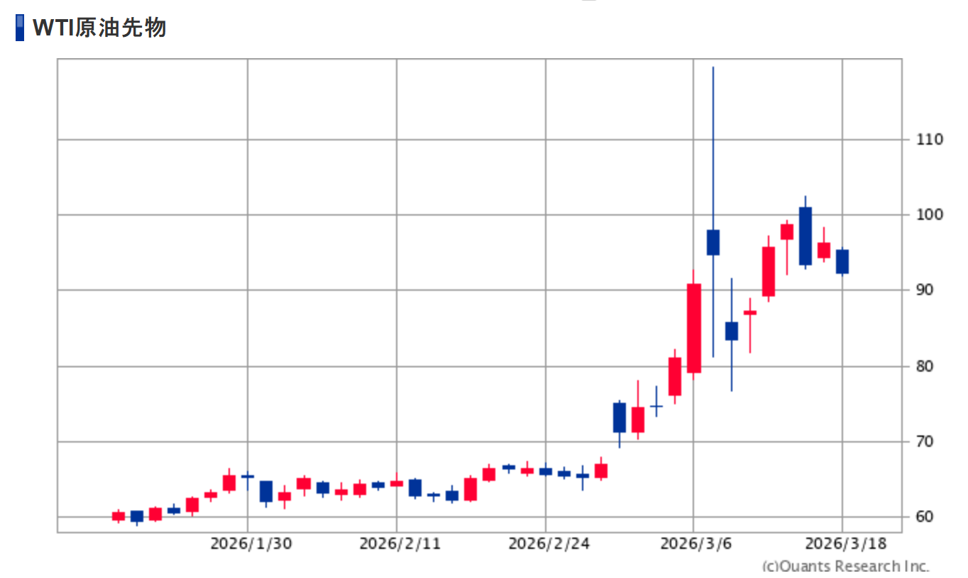 攻撃前は1バレル65ドル前後だった原油価格は、3月16日時点で100ドルを突破。わずか1ヵ月で50%を超える大幅な上昇となっています。