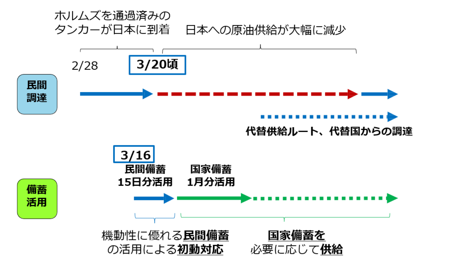 このうちまず民間備蓄を15日分、その後国家備蓄を当面1ヵ月分放出することが決定されています。その後は必要に応じて国家備蓄を放出し、並行して輸送ルートの確保や中東以外の地域からの調達を目指す方針です。