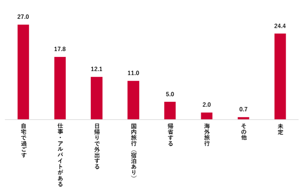 次に多かったのは「未定」で24.4%でした。アンケート時期が2月だったことを考えると、実際には日帰りや宿泊を伴う国内旅行に出かける方の割合がもう少し増えると考えられます。
