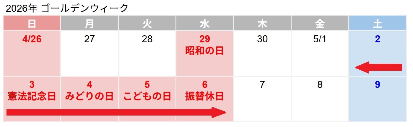 2026年のゴールデンウィークは何連休?